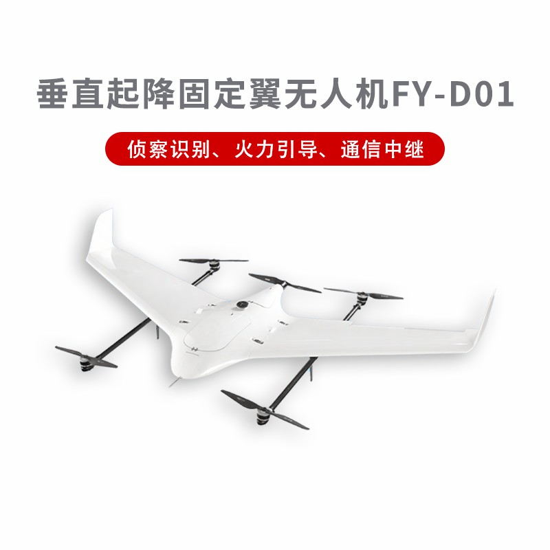 垂直起降固定翼無人機FY-D01型,兼具旋翼與固定翼優勢,其結構緊湊,便于運輸,抗風能力與防護性能好,適應復雜環境。續航持久,巡航穩定,載重2.5kg,可滿足日常執行任務需求。